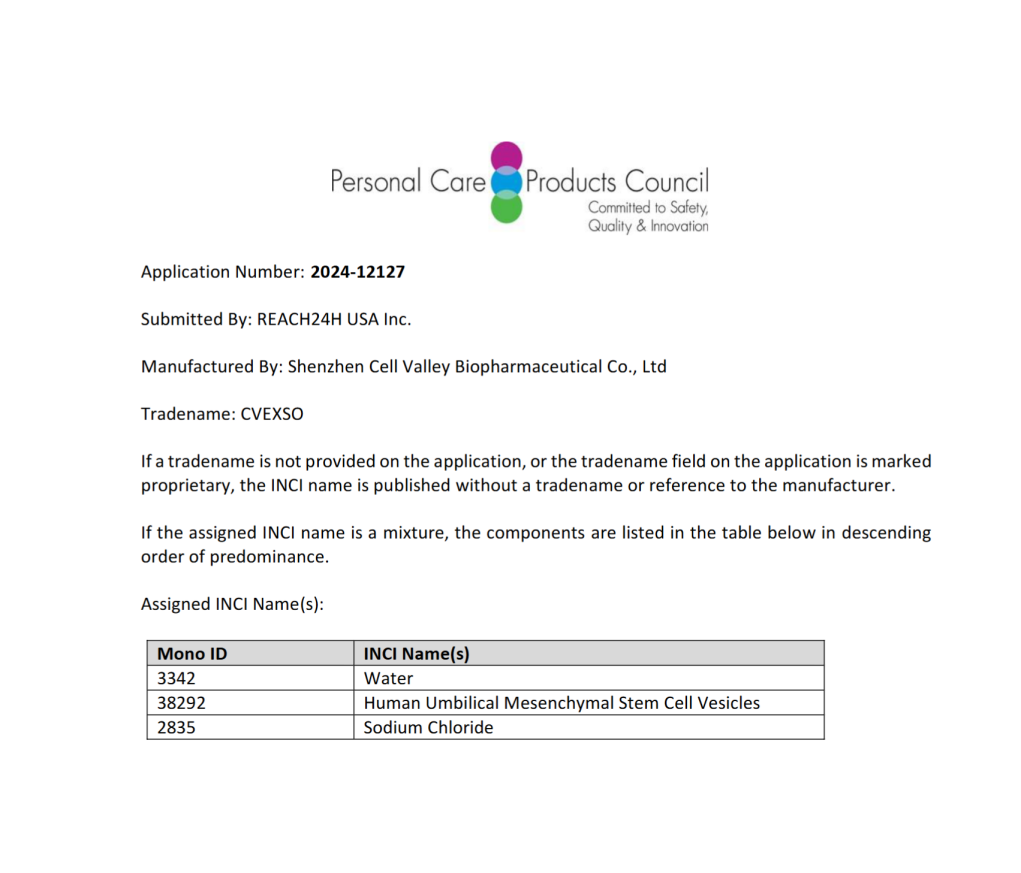 近日,深圳细胞谷生物制药有限公司(以下简称“深圳细胞谷”)自主研发的“脐带间充质干细胞囊泡”(INCI编号:38292)(INCI名称: Umbilical Mesenchymal Stem Cell Vesicles,商品名:CVEXSOTM)正式通过国际化妆品成分命名委员会(INC)审核,并纳入《国际化妆品成分词典和手册》。这一认证标志着中国企业在化妆品生物活性成分领域实现国际标准突破,为全球抗衰护肤市场注入革命性技术力量。