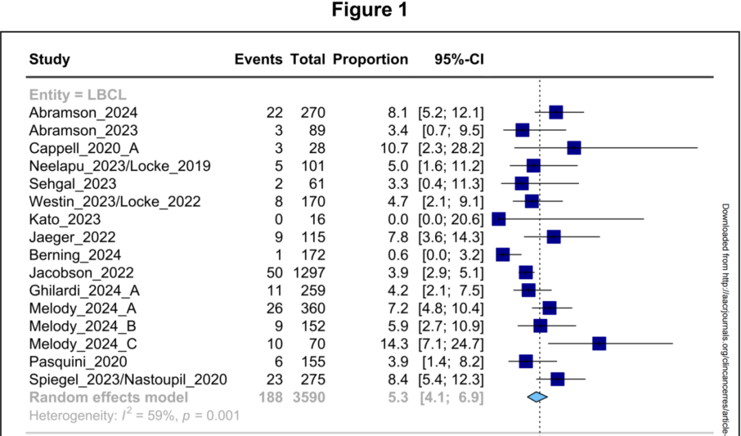研究人员在MEDLINE、Embase和 Cochrane Library CENTRAL数据库中进行了文献检索,随后筛选了FDA批准的六种治疗多发性骨髓瘤和淋巴瘤的CAR-T细胞产品的所有临床研究,包括:axi-cel,tisa-cel,ide-cel,cilta-cel,liso-cel,brexu-cel。结果如下: