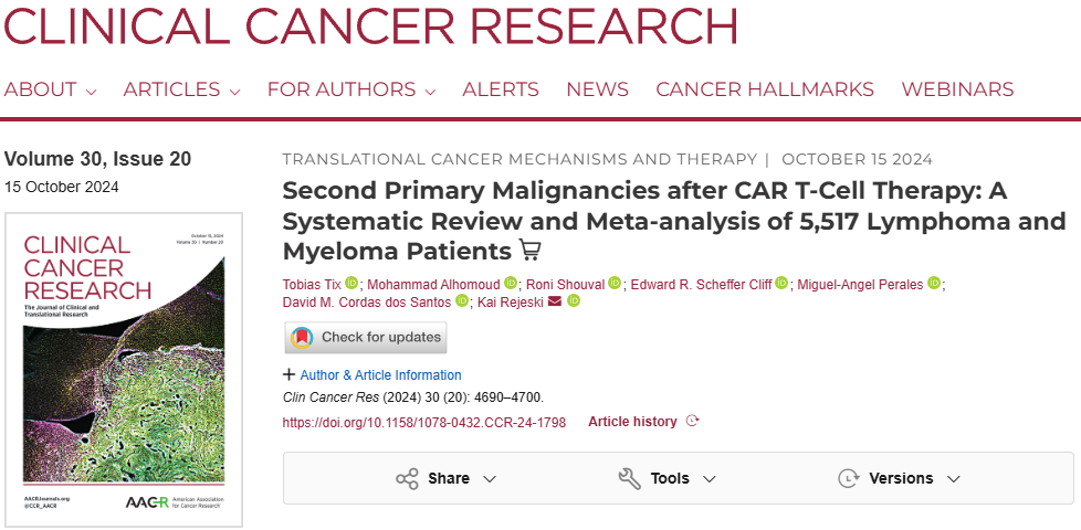 [2] Tobias Tix, Mohammad Alhomoud, Roni Shouval, Edward R. Scheffer Cliff, Miguel-Angel Perales, David M. Cordas dos Santos, Kai Rejeski; Second Primary Malignancies after CAR T-Cell Therapy: A Systematic Review and Meta-analysis of 5,517 Lymphoma and Myeloma Patients. Clin Cancer Res 15 October 2024; 30 (20): 4690–4700.