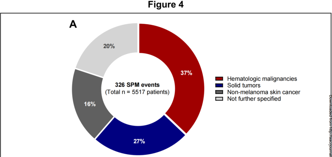这篇文章的数据显示,所筛选的5517位接受了CAR-T细胞治疗的患者,有326(6%)位患者有SPM,326位患者只有5例是T细胞恶性肿瘤(1.5%),而且SPM与治疗方式,随访持续时间和CAR-T治疗前所使用的治疗方法的数量有关,且研究结果并未表明CAR-T的SPM频率高于以前的标准治疗策略,所以并不能以此断定CAR-T细胞治疗与SPM有直接关联。该研究明确得出一个结论:CAR-T细胞疗法治疗后罹患第二原发性恶性肿瘤的风险没有增加,和其他标准治疗方案风险相当。