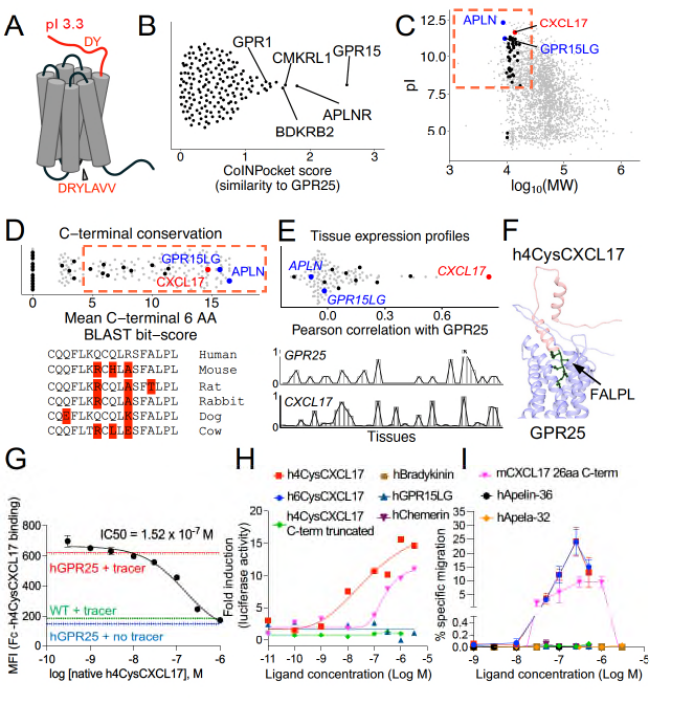 在确定GPR25为关键性的淋巴细胞趋化性受体后,研究者尝试通过生物信息学手段对与其存在相互作用的配体进行鉴定。以GPR25的结构特性为基础,通过计算机模拟和结构域预测确定筛选标准,在获得多个候选配体后进一步评估其与GPR25在49种非淋巴组织中的表达相关性。结果表明,CXCL17的表达模式与GPR25阳性细胞的组织浸润相关,提示CXCL17可能是GPR25的潜在配体。体外实验表明,表达GPR25的细胞系可以与Human IgFc-4CysCXCL17结合,而这一作用可以被未标记的4CysCXCL17阻断,这初步印证了生信分析的结果,证明了GPR25与CXCL17在体外存在相互作用。