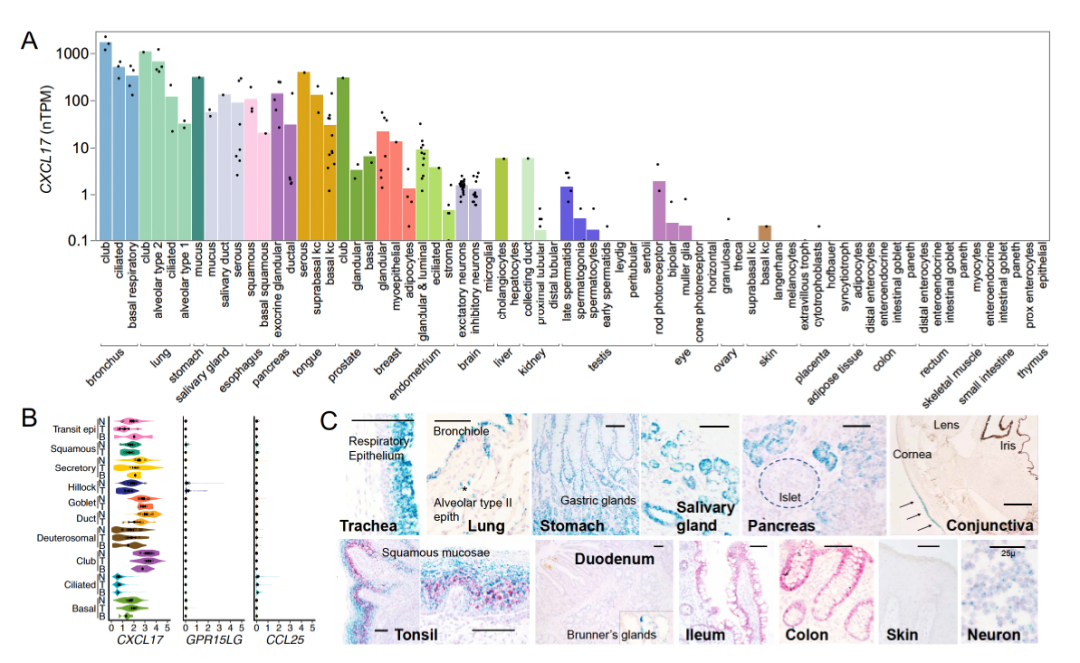 美国斯坦福大学医学院Borja Ocón,Menglan Xiang和Yuhan Bi共同合作取得了重要进展。他们研究发现了肺、非肠粘膜和中枢神经系统的淋巴细胞GPR25-CXCL17趋化亲和轴,该轴参与调控非肠道粘膜和中枢神经系统的免疫和耐受性,相关研究成果已于2024年9月18日在线发表于《Nature》。接下来将大致介绍一下这篇研究。